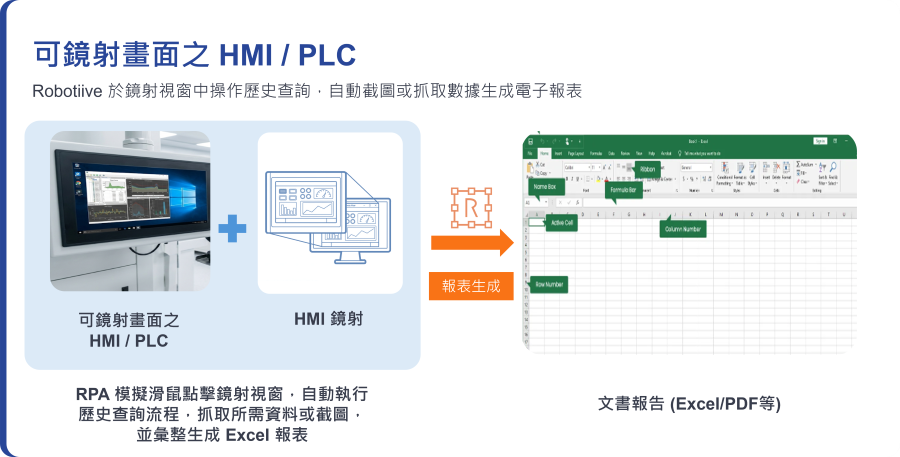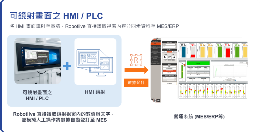 Robotiive 以非侵入式技術,即時擷取機台畫面數據並自動回寫至 MES、ERP 或 SCADA 系統。解決老舊設備無法連網問題,取代人工抄寫,確保生產數據即時、準確且可追溯。