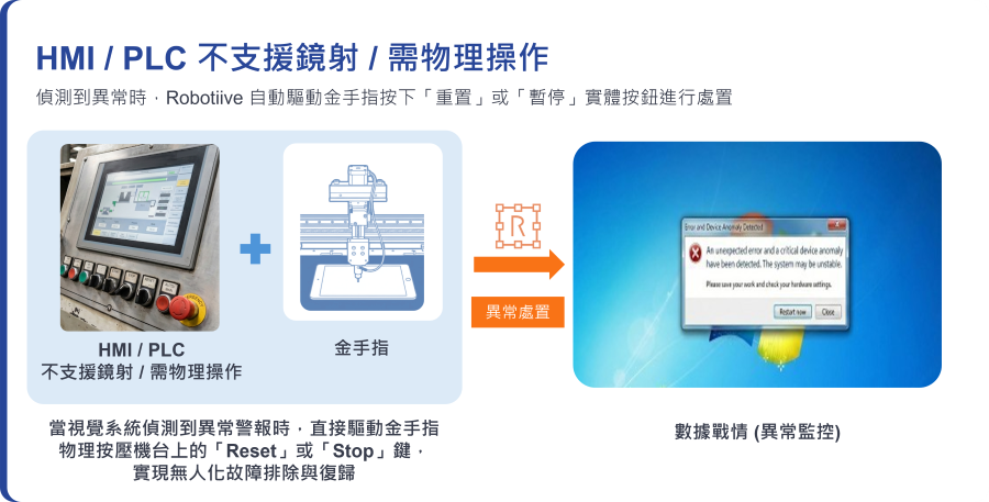 偵測到異常時,Robotiive 自動驅動金手指按下「重置」或「暫停」實體按鈕進行處置