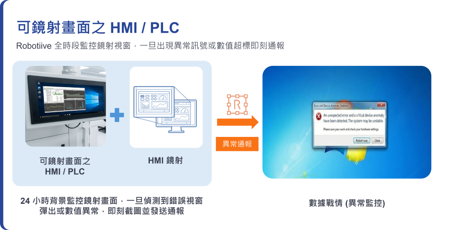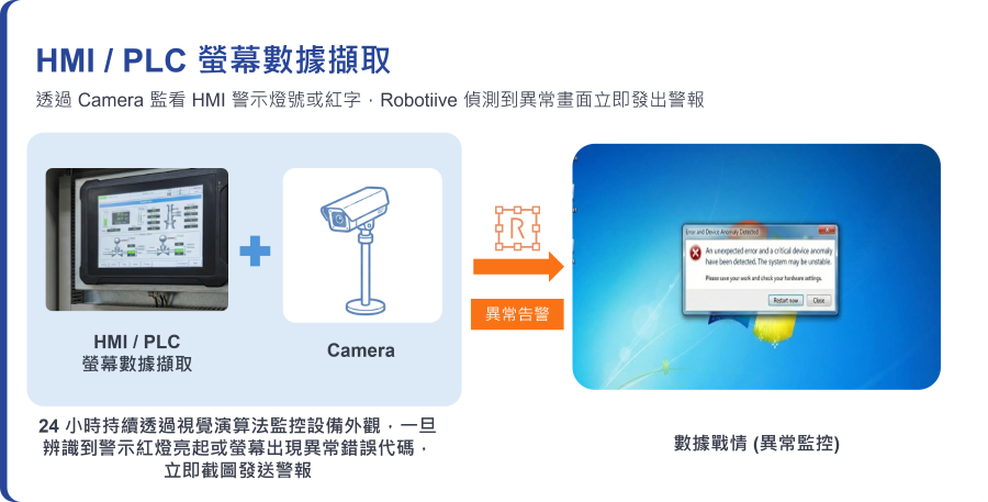 透過 Camera 監看 HMI 警示燈號或紅字,Robotiive 偵測到異常畫面立即發出警報