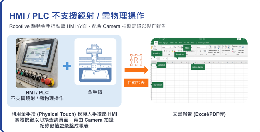 Robotiive 定時驅動 Camera 拍照存證,並將 HMI 上的數據轉錄成 Excel 報表歸檔